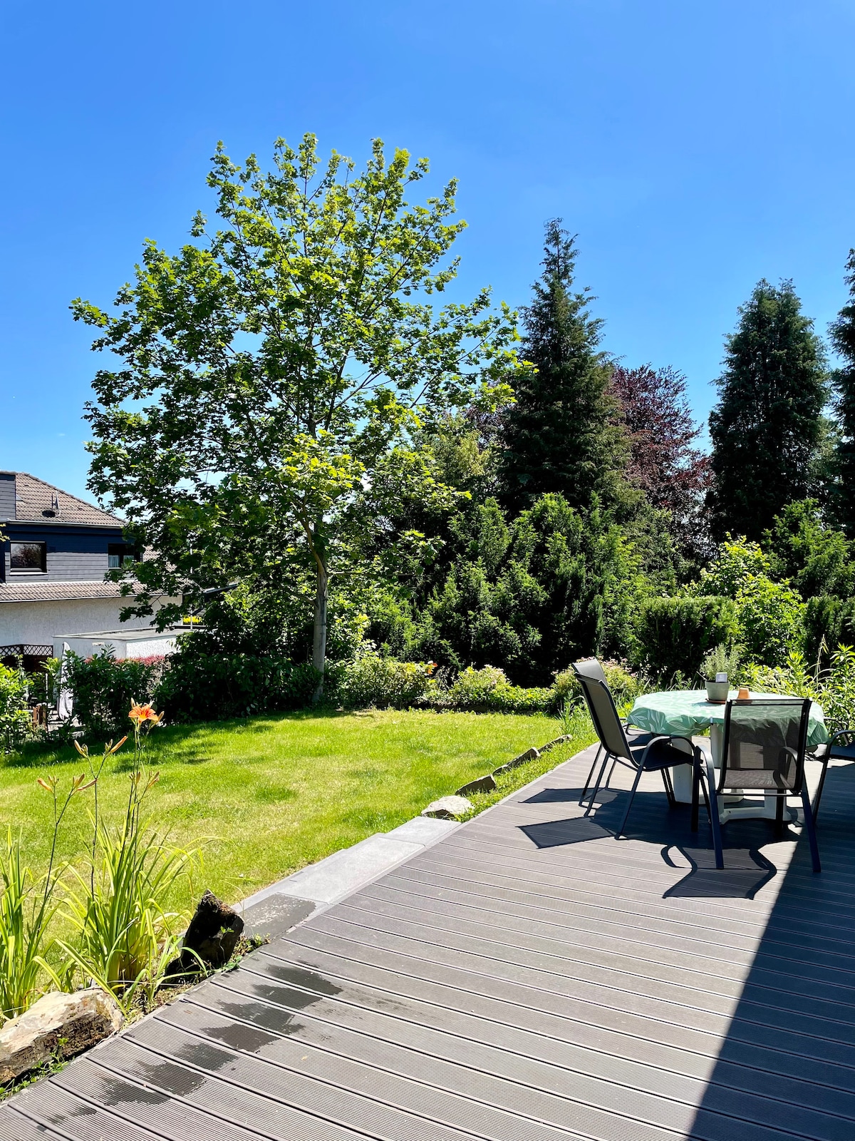 Im Grünen und doch nah zu Bonn und Köln gelegene Unterkunft, ca. 60 m2, eigener Eingang, zusätzlich ca. 15 m2 Süd-Terrasse an einem großen Garten mit altem Baumbestand. Beachte bitte, dass sich durch die Nähe zum Garten auch einmal ein Insekt in die Wohnung verirren kann. Die Wohnung ist ausgestattet mit zwei großen Zimmern, integrierter Küche , Flur und Bad. Die Nutzung der wohnungseigenen Sauna ist gegen eine geringe Gebühr möglich. Eine Nutzung des Gartens ist nach Absprache möglich.