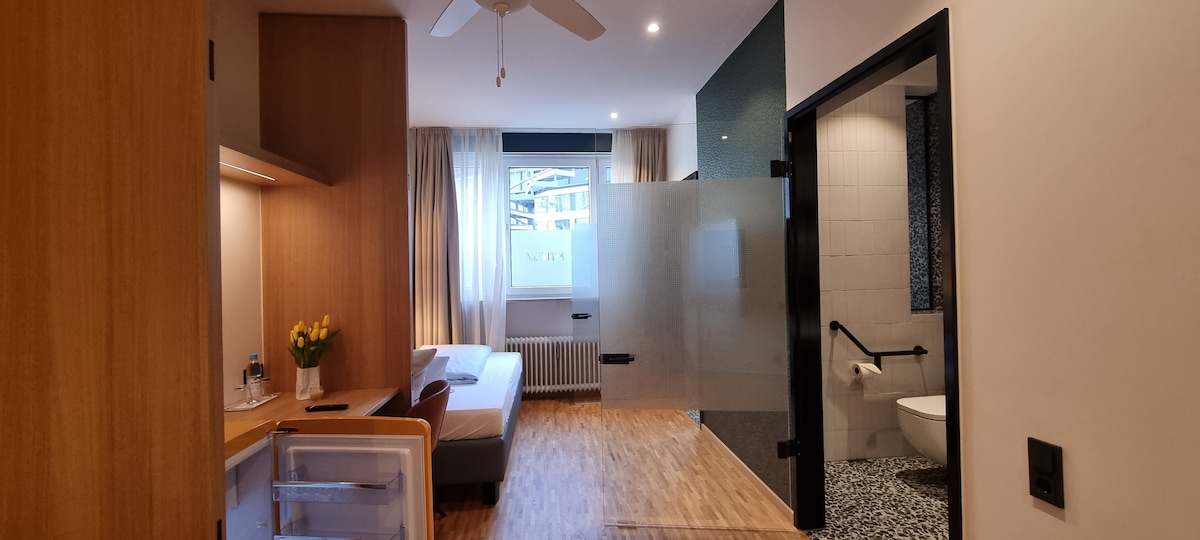 Modernes Design-Zimmer direkt am Münchner Hauptbahnhof – ideal für Geschäftsreisen und Städtetrips. Helles, hochwertig eingerichtetes Zimmer für 1–2 Personen mit King-Bett oder Twin. 👉 Wunsch bitte nach Buchung angeben. Privates Bad, WLAN, Smart-TV und Arbeitsplatz vorhanden. Restaurants, Supermärkte und Verkehr direkt vor der Tür. Altstadt und Oktoberfest schnell erreichbar. Ruhig bei geschlossenen Fenstern dank moderner Isolierung. 24h Self Check-in per Code.