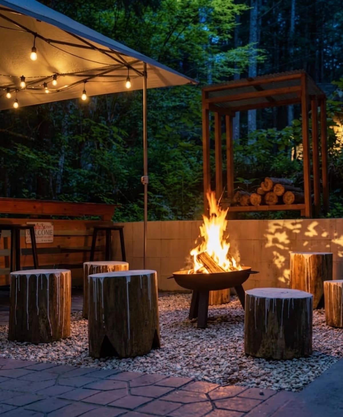 一栋可以看到菩提树的房子,庭院里有篝火