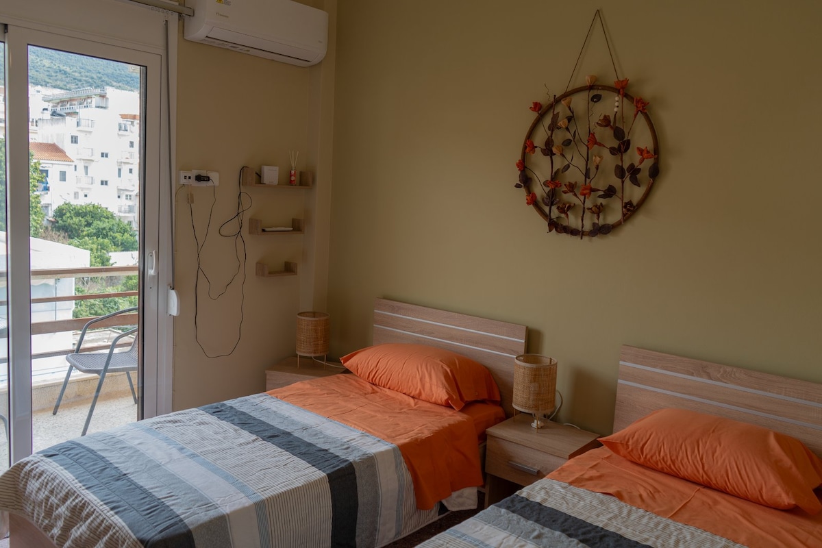 Διαμερισμα 30 τ.μ. στον τρίτο όροφο με ασανσέρ και άνετο μπαλκόνι με τέντα. Δύο μονά κρεβάτια που ενώνονται σε ένα άνετο διπλό. Εξοπλισμένη κουζίνα και μπανιο. Φωτεινό και ήσυχο, με wifi, smart TV και κλιματισμό. Βρίσκεται δίπλα στο υδροθεραπευτήρειο του ΕΟΤ. 30 sq.m apartment on the third floor with elevator and 2.00 x 4.00 balcony with awning. Two single beds that easily turn into a double, fully equipped kitchen and bathroom. Very sunny and quiet. Wifi and a/c. Next to the thermal springs.