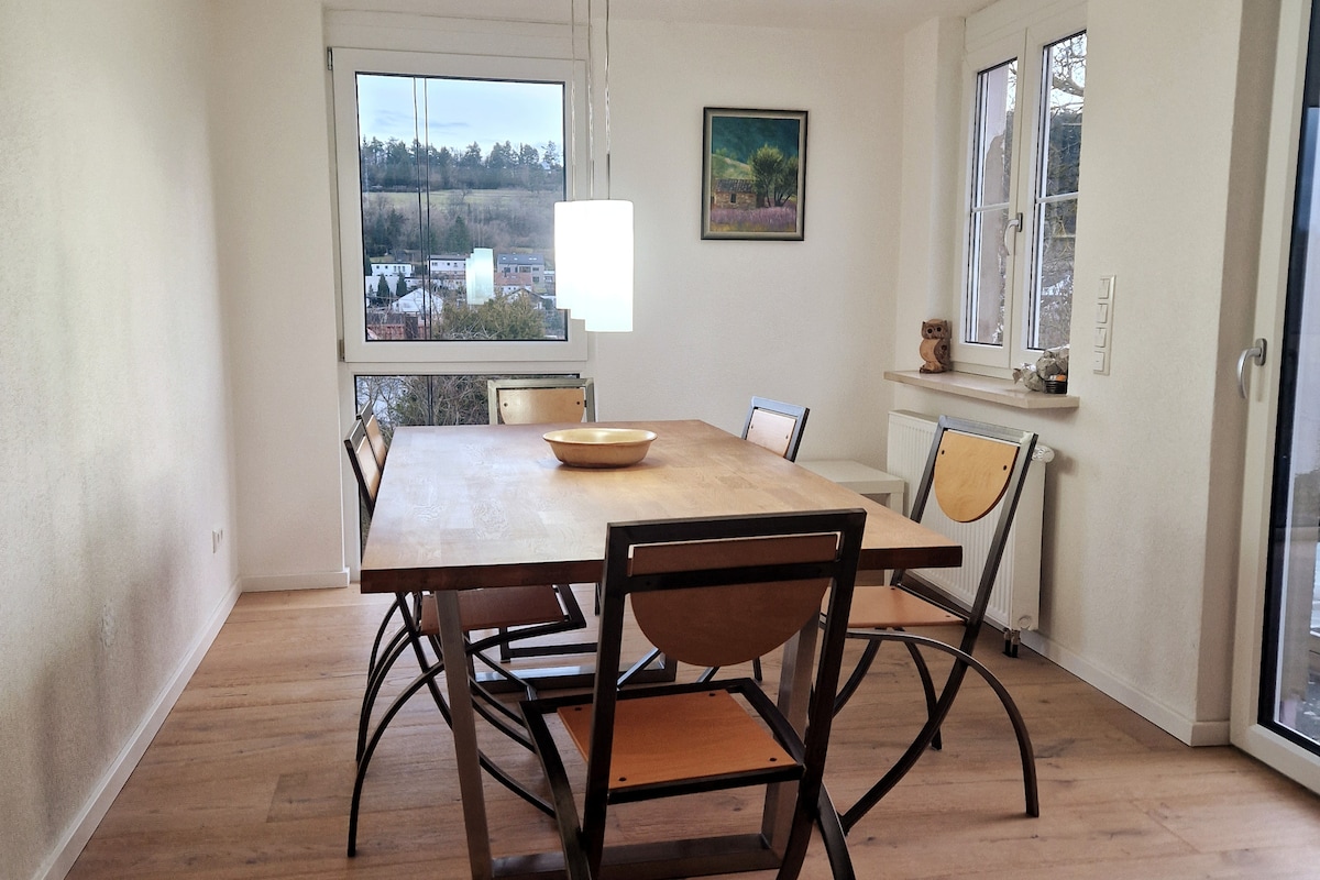 Geniessen Sie die Ruhe und den wunderschönen Ausblick auf den Wald und Aidlingen, die Perle des Gäus. Ein Schlafzimmer ist mit Zugang zu einem kleinem Balkon und das Esszimmer zu einem großen Balkon. Die Wohnung ist ebenerdig. Zum Naturschutzgebiet Venusberg sind es nur 5 Min zu Fuß, mit dem Auto ist man in 15 Min im Schwarzwald. Es gibt eine halbstündige Busanbindung zur S-Bahn Richtung Stuttgart oder Herrenberg.