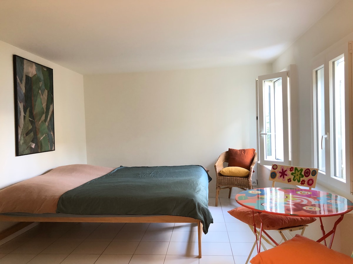 Logement situé dans le quartier des Planches, proche de toutes commodités (à pieds, gare : 15min, place du marché / centre ville : 10min, lac : 5min). Parking: gratuit dans la rue avec disque ou payant au parking du Donner. Le studio est équipé d’une kitchenette et d’une salle de bain douche. Deux lits de 90cm peuvent être accolés ou séparés. La vaisselle, la literie et les serviettes / linges sont fournis.