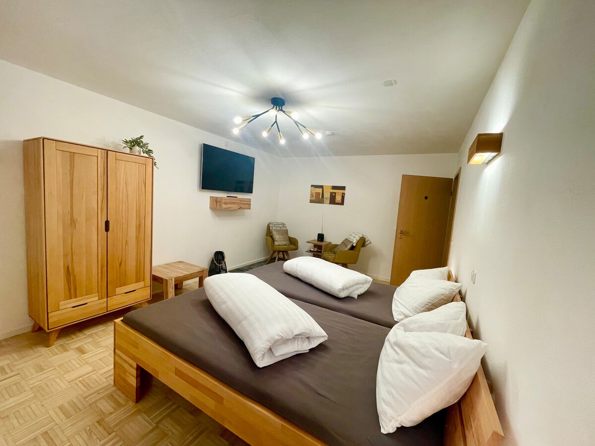 Geräumige Erdgeschosswohnung (ca. 130 qm) in idyllischer Lage. Separater Eingang mit überdachter Sitzgelegenheit, kleiner Sonnenterrasse und gemütlicher Einbauküche. Wohnung hat Wlan, Sat TV, Zentralheizung, Waschmaschine und kostenlose Parkplätze. Unterstellmöglichkeiten für Fahr- und Motorräder ebenso verfügbar (Absprache vorher notwendig). McDonalds, Bäckerei und Supermärkte (REWE, V-Markt) nur 500 m entfernt und leicht zu Fuß erreichbar.
