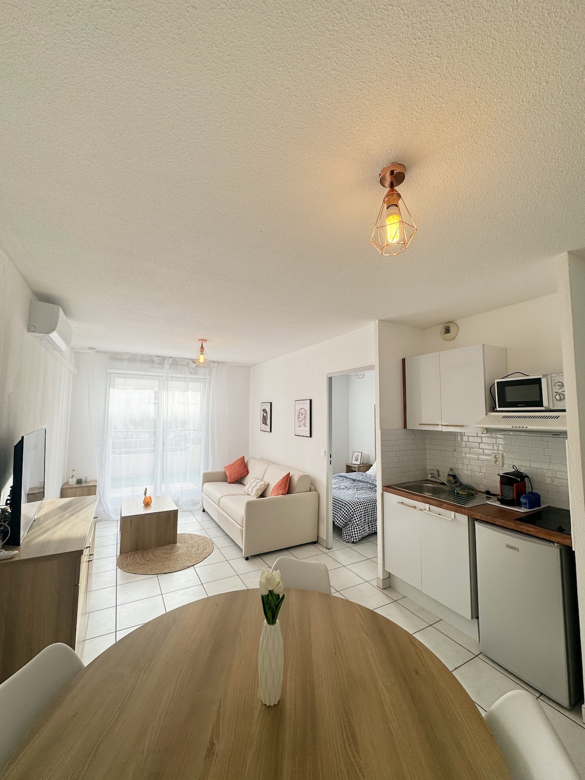 ☀️Relax in this quiet and elegant accommodation. ☀️In the heart of the marinas, pretty 20m2 studio and terrace with beautiful marina view, 3rd floor (no elevator). For 2 adults or 1 adult and 1 child ☀️It consists of a living room opening onto a beautiful terrace, air conditioning, a fully equipped kitchen, Nespresso, fridge, dishwasher, washing machine, electric oven, microwave... ☀️8 minutes walk from the beach and shops ☀️Private parking and free WIFI 🏊♂️POOL OPEN FROM May 15 to September 30