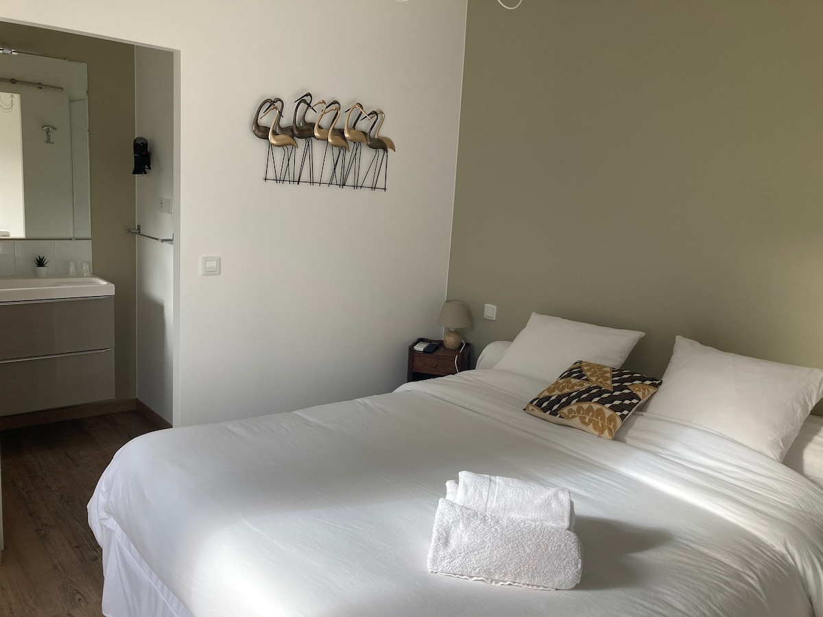 Ce logement tendance ne manque pas de charme c est une chambre avec une excellente literie en 160 . L endroit est très calme ,pour une nuit reposante, salle de bain avec douche italienne .Accès cuisine le petit-déjeuner est compris dans le prix Parking devant la maison .