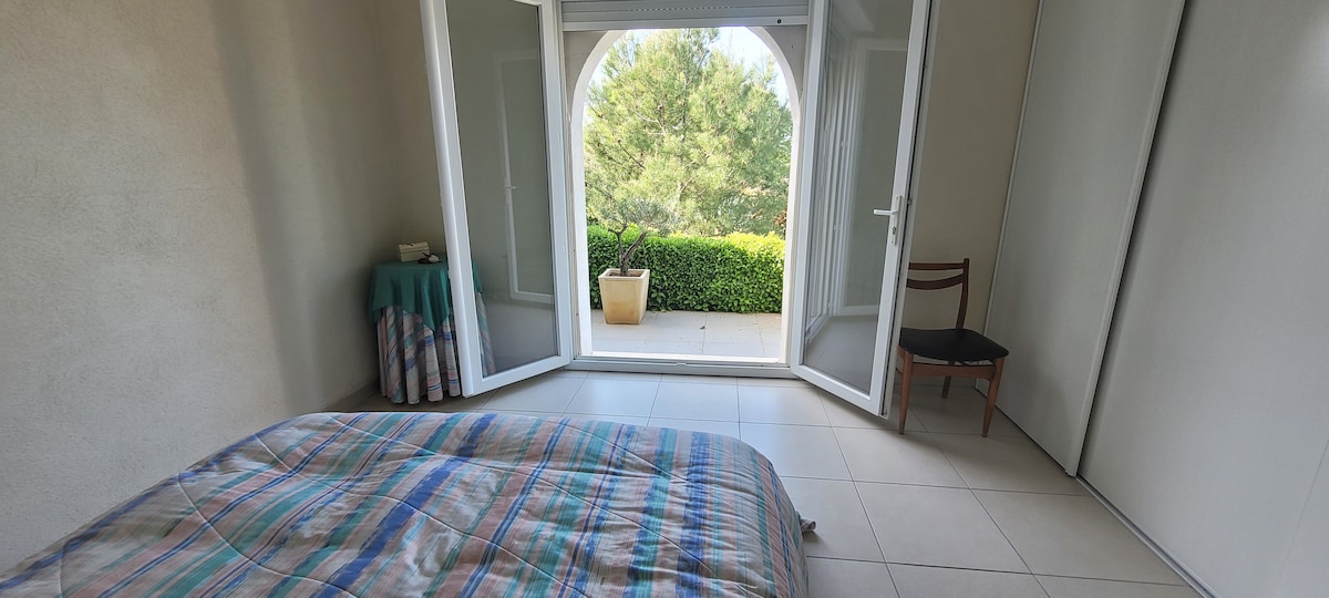 Chambre privée dans notre villa familiale à proximité de Montpellier. La chambre est bien équipée et spacieuse, possédant une porte fenêtre donnant sur le jardin, une vue paisible sur la piscine et les arbres. Petit déjeuner gracieusement offert (thé, café, pain, confiture....). Une salle d'eau privée vous sera réservée, directement accessible depuis la chambre (un couloir à traverser). L'environnement est remarquablement calme, parking gratuit dans la rue, accès tramway à pied (25 min environ).