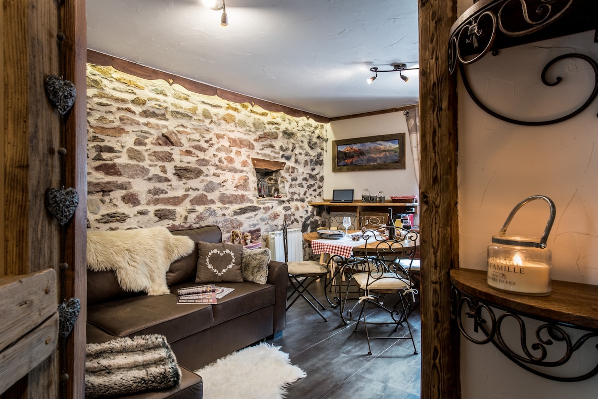 Au cœur d'un petit hameau calme, charmant studio en rdc de maison, rénové et atypique par son plafond voûté. Salle de bain / toilette, cuisine toute équipée ouverte sur salon, mange debout avec tabourets, chambre séparée par un claustra. Terrasse et petite cave attenante pour entreposer deux vélos. Emplacement en vallée au pied de la station de la Plagne, situation idéale pour accéder au stations voisines des vallées de la Tarentaise et Bozel . Linge de lit et serviettes fournis. Boîte à clefs.