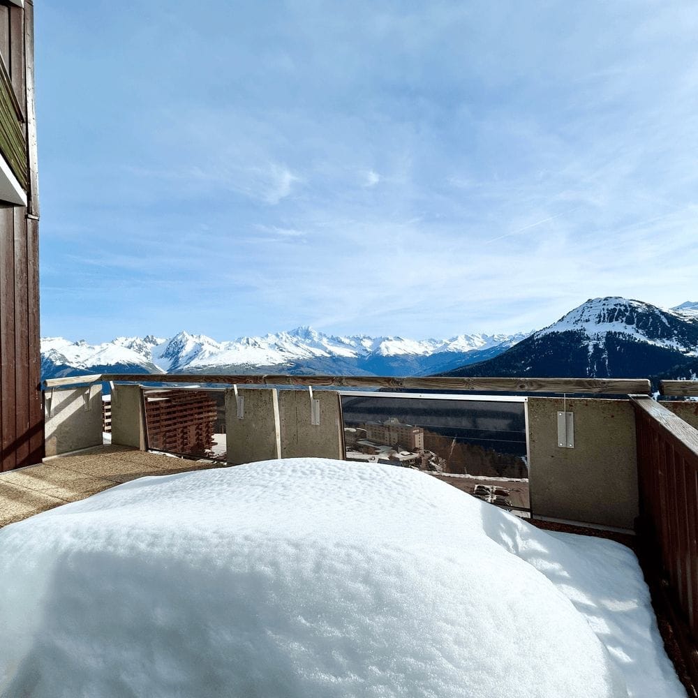 Skis aux pieds, appartement de caractère pour 6/8 personnes au coeur du village de Plagne-Montalbert. Situation centrale (rue piétonne) à deux pas des commerces, restaurants etc. Rénovation complète en 2022, charme et confort - poutres apparentes, vieux bois, parquet de chêne, volumes, triple vitrage, TV écran plat, enceinte Marshall etc. 3 chambres, 3 salles de bain, 3 WC. 2 matelas en plus possibles. Cuisine équipée, poêle, local ski. Balcon, vue sur les montagnes et le vieux village.