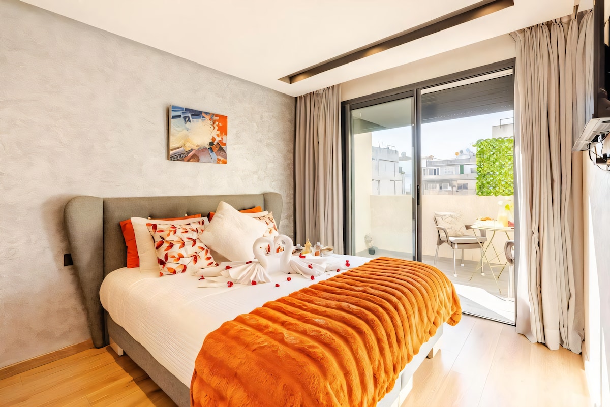 Bienvenue dans notre studio récemment rénové et moderne, offrant une vue imprenable sur la mer et la majestueuse Mosquée Hassan II. Profitez des levers et des couchers de soleil époustouflants directement depuis le confort de l'appartement. Ce lieu magnifiquement conçu est idéalement situé près de la marina animée, offrant un accès facile à une variété d'options de shopping et de restauration.