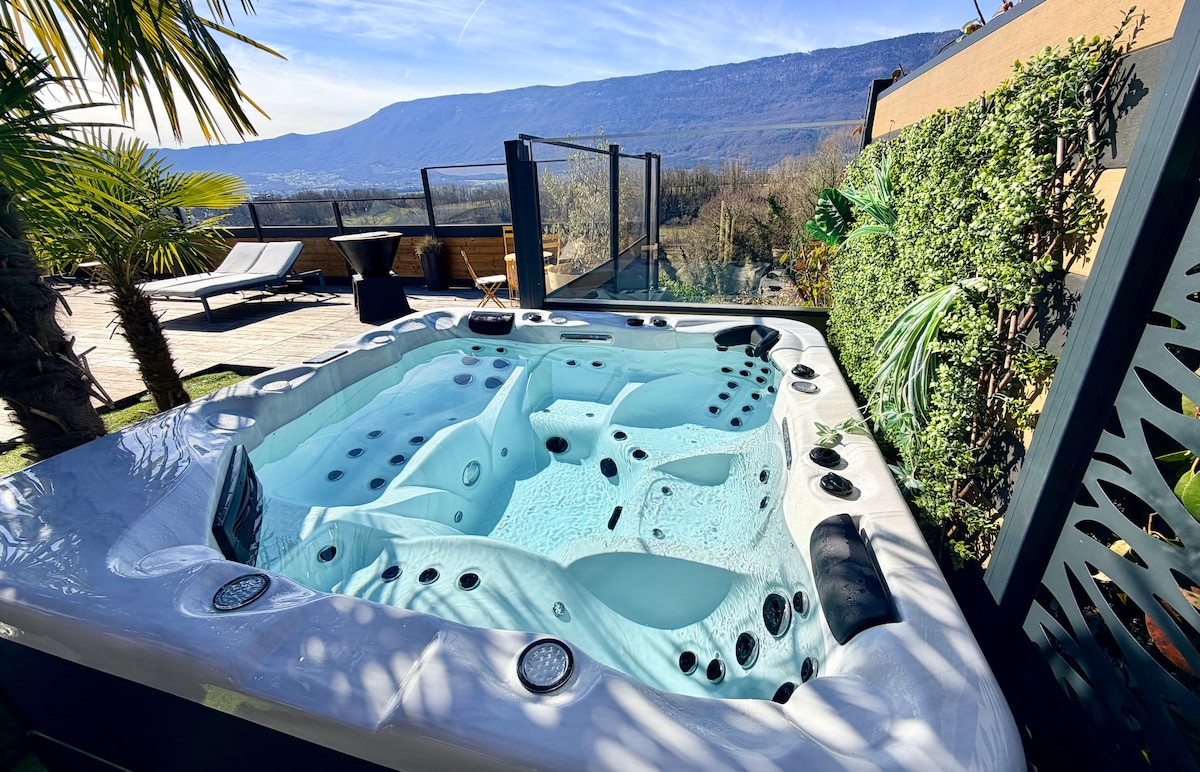 40 min drive from Geneva airport and 25 min from Annecy's lake, enjoy a distinct experience in a charming cottage with private SPA (available all year) and heated pool, within a beautiful natural scenery. Share a unique stay, as a couple, with friends , including best services: Champagne as a welcome gift, unlimited SPA, air conditioning, bathrobes, slippers, fully equipped kitchen, Wifi, flat screen with Netflix, welcome products, garden of 200sqm at your disposal...