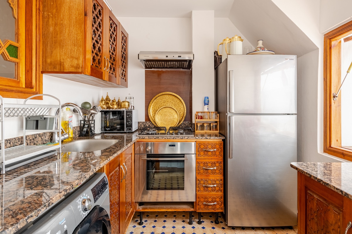 ** LA CASA TIENE WIFI. Una azotea deliciosa, una decoración elegante, un ambiente relajante y tranquilo que te ayudará a disfrutar de tus vacaciones. Situada perfectamente en la medina y con fácil acceso a los comercios. Una chimenea que da un ambiente relajante, duchas con buena presión, sábanas de algodón y un entorno para disfrutar.