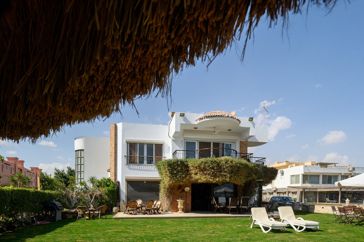 Rocky beach! Families only! sit back and relax at Stella Sea View Ain Sokhna. A standalone home, first row on the beach. Wake up to a beautiful view & a well designed space. The coral & green tones of this home blend perfectly - making this vacation home aesthetically divine. With a big terrace on the beach, you are 2 steps away from the shore and the shared pool. Just relax and take a break from the busy city life. A quiet private location that will certainly put you in a state of pure bliss