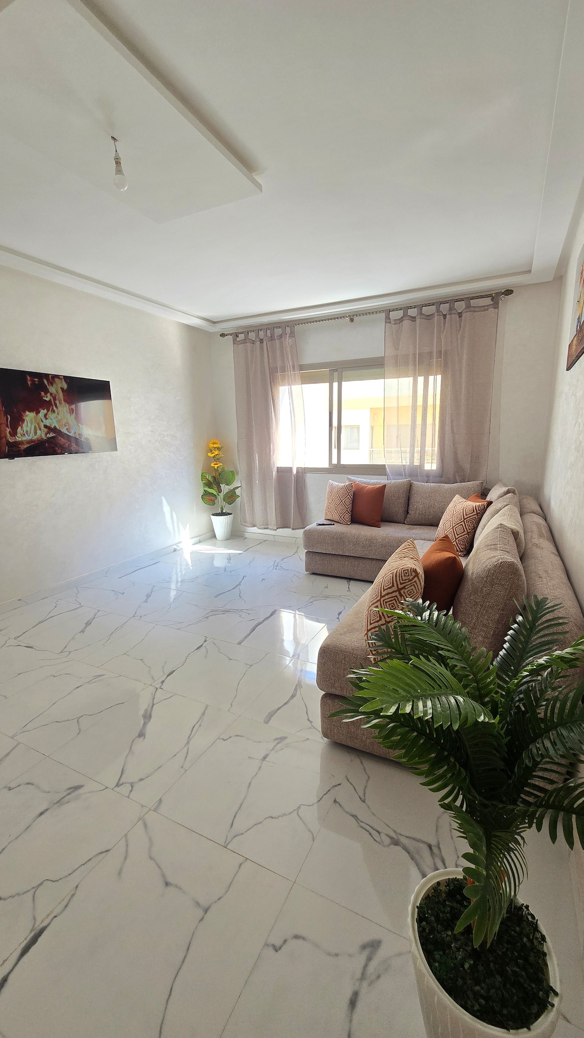 Chic & cozy apartment minutes from the historic Medina of Fes Modern design with warm details for a relaxing atmosphere Spacious living room to unwind after exploring the city Fully equipped kitchen for home-style meals Comfortable bedroom and clean, functional bathroom WiFi, AC, and washing machine for your convenience Perfect for married couples, families, or friends visiting Fes