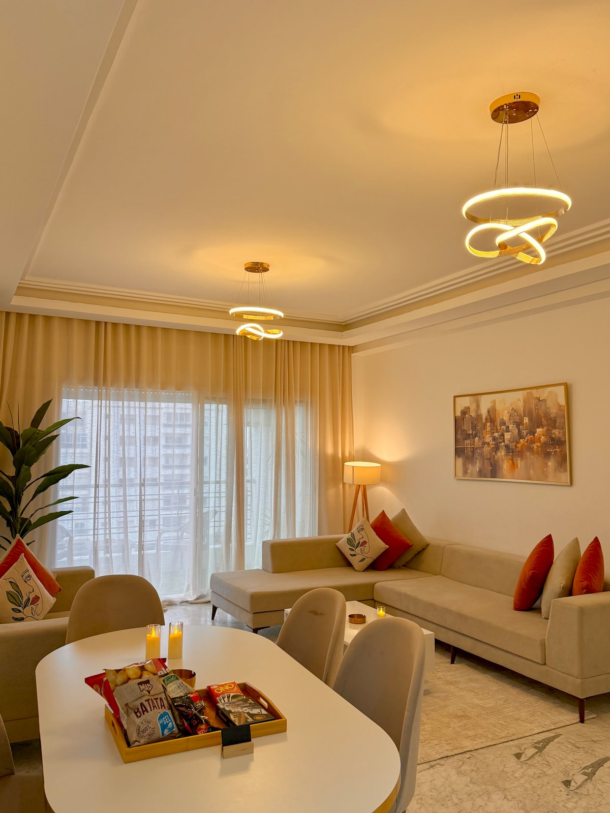 Appartement moderne avec salon lumineux et chambre confortable, décoré avec goût et entièrement équipé pour votre confort. Profitez d’une piscine élégante et privative dans un jardin agréable pour des moments de détente inoubliables. Situé à Ain Zaghouan Nord dans une zone résidentielle de haute qualité , à proximité des Berges du Lac et de La Marsa et à 10mn de 🛫 Il offre un emplacement idéal entre calme, loisirs et attractivité. L’endroit parfait pour allier repos, style et convivialité