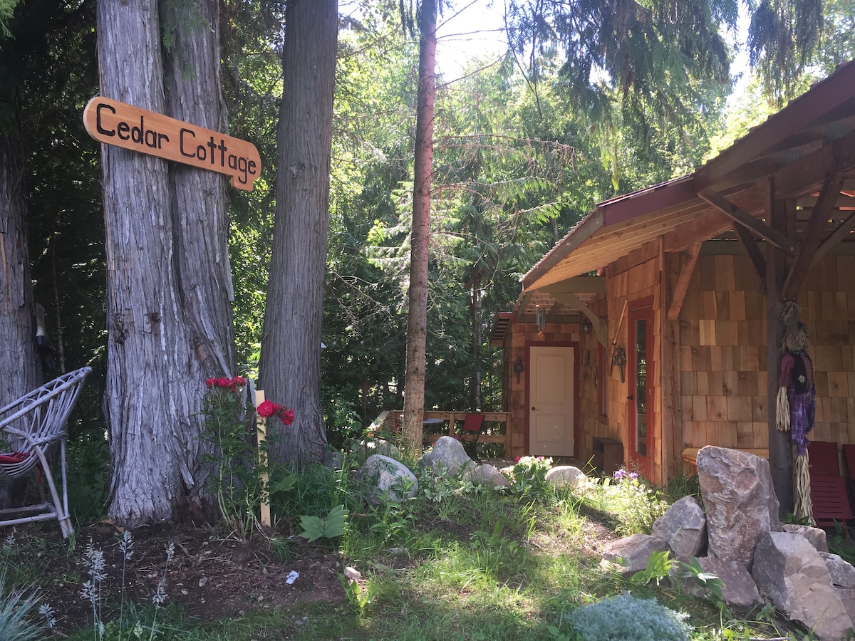 The Cedar Cottage is a 1 bedroom, cozy and romantic cottage with all the needed amenities. Numerous windows allow ample light in with the feeling of being nestled in the trees. A covered garage is provided for guests to park. Beautiful deck nestled in the cedars with glimpses of the Purcell Mountain range and Kootenay Lake. Access world class mountain bike trails or walk the river trail right from the Cedar Cottage.
