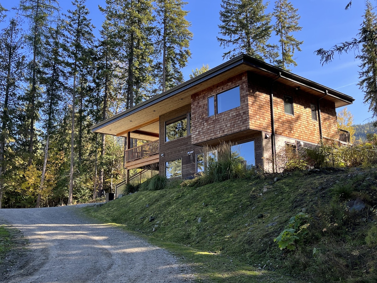 ***Sorry friends we cannot host your dogs*** Modern cabin, ideal for nature lovers, skiers and snowboarders, snowmobilers, mountain bikers, hikers, or those exploring nearby Nelson. The sun-drenched deck looks out onto a stunning ponderosa pine and sits just steps from an active wildlife game trail. Set on seven peaceful acres, the property is shared with elk, deer, rabbits, two resident ravens, and the occasional wild turkey—offering a truly immersive mountain experience.