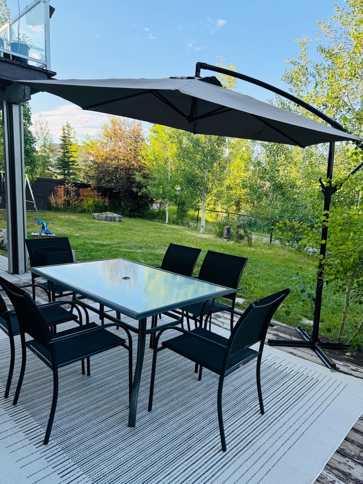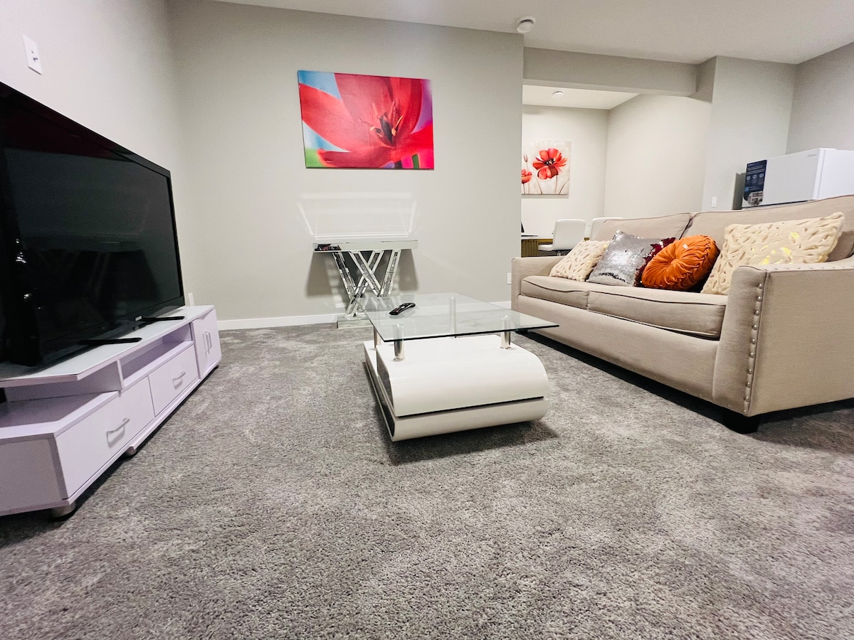 This walkoutbasement features: One cozy bedroom with a queen bed, full bunk bed and air mattress three-piece bathroom Spacious Kitchenwith dining table and chairs. A bright living room with 9-foot ceilings and large windows. TV, a sectional sofa, a fireplace, and sofa bed. There's also a work space with a desk and chair. Laundry Facilities Large Backyard and access to a beautiful pathway around a nearby pond. This unit has easy access to Deerfoot Trail and is close to the airport