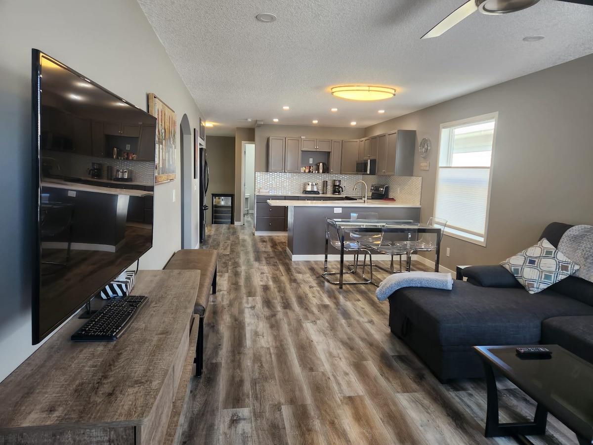 Kick back and relax in this quiet and stylish newly renovated clean bright home . This unit is not a basement suite like other comparably priced listings . Very close to shopping with easy access to down town. Highway 2 just 3 minutes away . Reserved off street parking . Smart TVs all wifi ready along with your personal kurig for hot drinks . Each bedroom has its own cordless phone charging station. 14 minutes to Calgary international Airport
