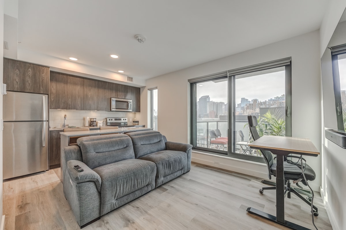 Experience Downtown Calgary in style and stay in this Recently built condo just minutes from Downtown! This 1 bed 1 bath private condo comes with a furnished patio and stocked kitchen. Having a night in? Our cozy living room includes a premium 55" Sony OLED TV with Amazon Prime, Netflix and chromecast built in and a big comfy power reclining couch! Perfect for work with a bamboo top electric powered standing desk w/ anti fatigue mat and a power bar to plug all your electronics.