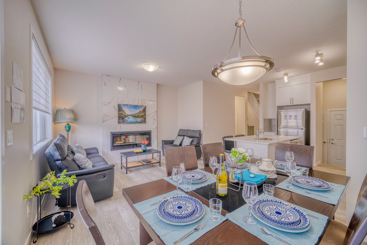 欢迎来到全新的有我们全家的爱的联排别墅,有我们全家对这个小家无限的爱。作为有大家庭出游经验的我们,用心布置的家庭房给小家庭舒适的旅行体验,双人房和大床房让四口之家也有足够宽敞明亮的空间。特别为夏日新装的中央空调+智能电视+Netflix 会员。值得一提的是我们的联排别墅位置超级棒,15分钟车程内可以到达卡尔加里国际机场,以及最著名的购物中心CROSSIRON MALL,COSTCO, 步行五分钟之内有McDonald's , Starbucks, Timhortons, 最具有竞争力的Nofrills 平价超市。注意:这个温暖的联排别墅距离令全世界都喜欢的班服国家公园(Banff national park)仅一个半小时车程,更是可以去看让人沉醉的路易斯湖, Hoodoos Trail Head, Bow Falls viewpoint....各处美妙绝伦的大自然的风景