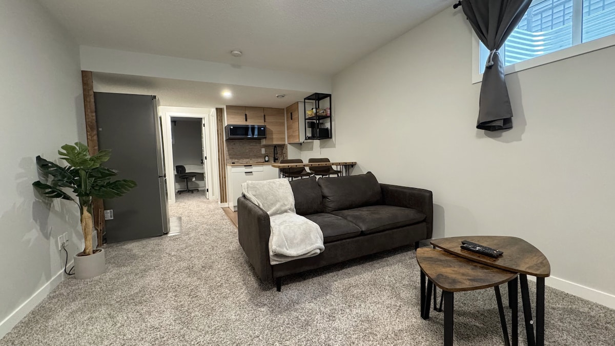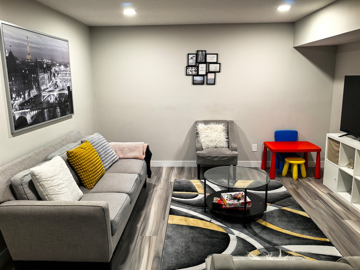 Welcome to our stylish 2-bedroom basement suite, where comfort meets entertainment! Nestled in a vibrant neighborhood, our modern retreat boasts two cozy bedrooms, each featuring plush bedding for a restful night's sleep. Need extra space? No worries – we've got you covered with an extra sofa that easily accommodate additional guests. • 7 MIN YYC AIRPORT • 5 MIN CTRAIN • 12 MIN CROSSIRON MALL • 20 MIN DOWNTOWN • 90 MIN BANFF