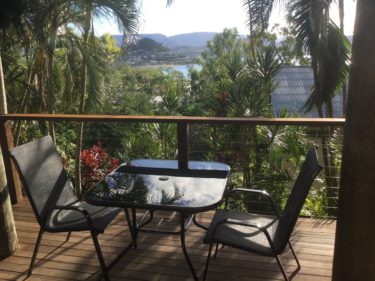 New suite with ocean, hilly rainforest and island views, providing a sense of peace and beauty. Close to the action of Airlie's restaurants and shops, yet tucked away enough to be a very relaxing experience Own entrance, balcony, garden landing, bathroom and kitchenette. 4 min drive or 15 min downhill walk to main street and public transport. Birds, breezes, treed valleys, rock gardens and wildlife. Suite situated at northern end of home, some daily sounds may be heard. Respecting your privacy.