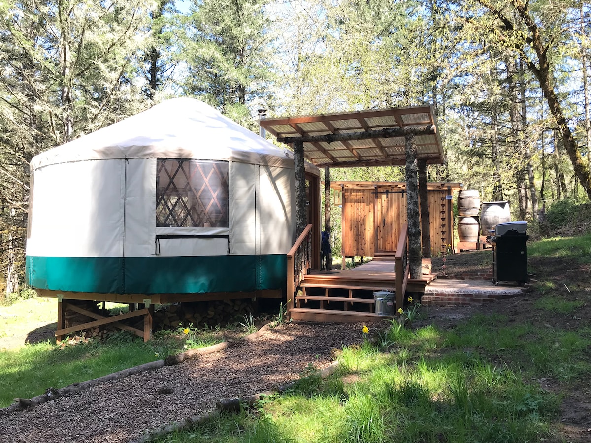 Year round all season glamping yurt in wine country. Private hand crafted yurt nestled among wild life and hiking trails. Experience a cozy wood stove, dome with view of stars and an out of this world hot shower with views. Picnic, sit around our outdoor campfire or read a book under a Pendleton blanket in front of the indoor wood stove. All of the kitchen ammenities for cooking. An adventure you won't forget. Sauna with cold shower rinse and private hot shower also on property!