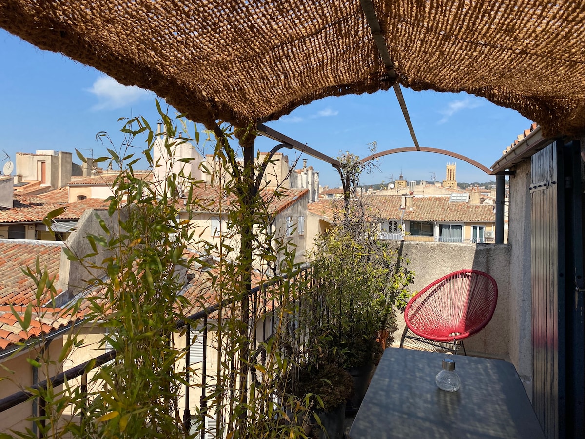 Two rooms duplex apartment located in the historical center of Aix-en-Provence a few steps from Cours Mirabeau and Place d'Albertas. Located on the top floor of a 3-storey building (no lift) you will be seduced by its charm, its sunshine, the absolute quiet and the beautiful view over the roofs of Aix-en-Provence and the Sainte Victoire. Chill out on the terrace and enjoy the blue sky from Provence and the silence ! Air-conditioned apartment.