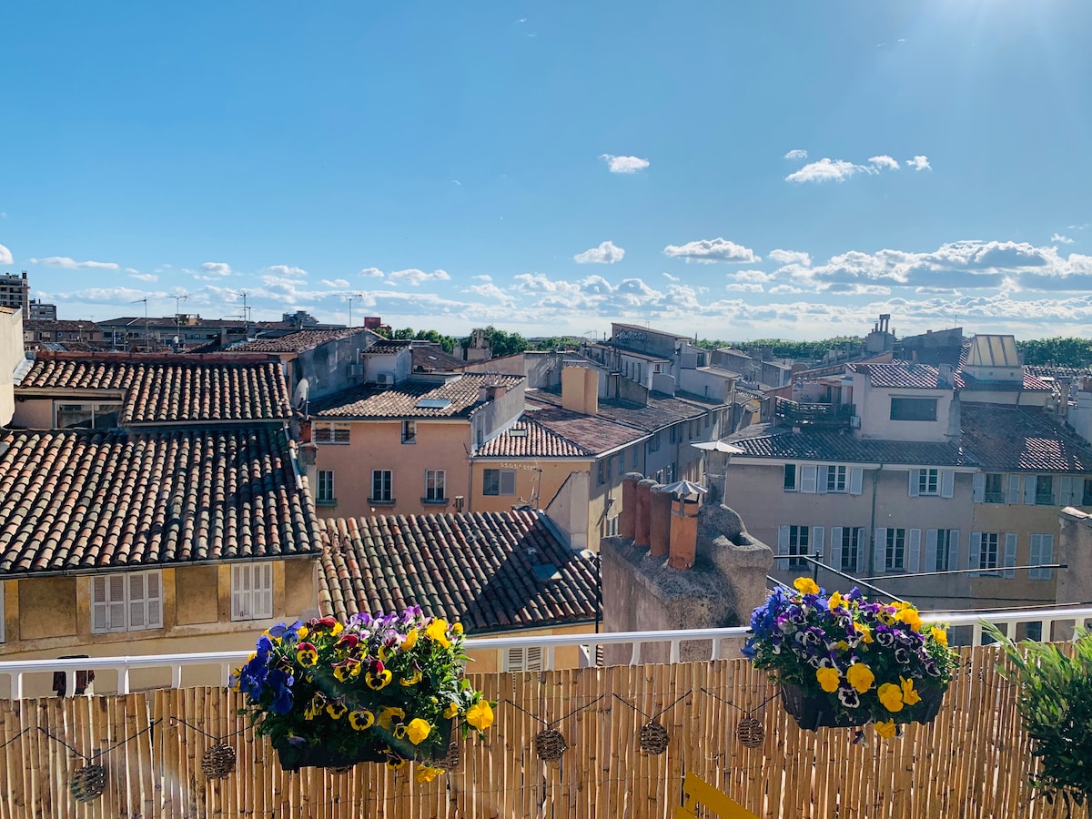 Profitez d'un logement central. Tout est à proximité. Vous êtes à 50 mètres du cours Mirabeau, dans une rue piétonne commerçante. La terrasse et la chambre sont en duplex, accessible par une échelle de meunier, elles ont une vue magnifique sur les toits de la vieille ville. La chambre à coucher est climatisée. 3 étages sans ascenseur. Bow-Window dans le salon.