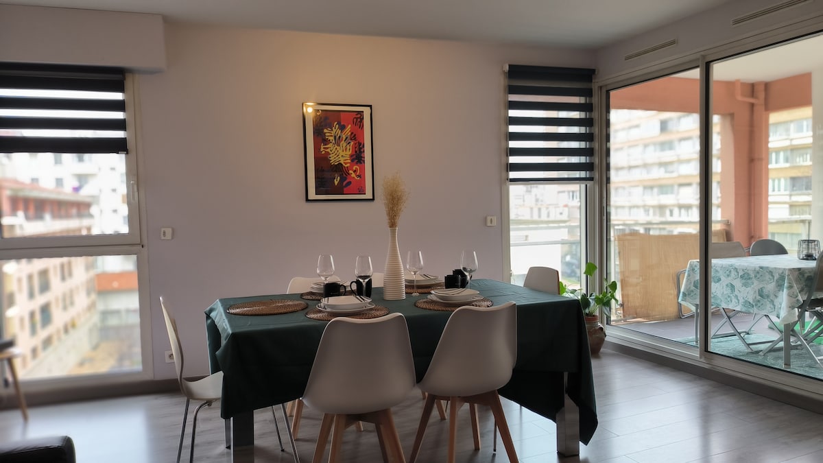 Appartement T2/3 neuf, 60 m², 6 personnes Rez-de-villa avec terrasse et son SPA Parking privatif dans la propriété Entrée indépendante Séjour / Cuisine aménagée grand standing, café grain, thé Une bienvenue locale vous attends au frais Salon avec son grand canapé couchage quotidien de 160*200 et sa TV XXL de 65" Chambre (couchage 160*200) avec TV de 43" Coin montagne fermé (couchage possible : 160*200 ou 2x80*200 ou 1x80*200) Climatisation Salle d'eau et WC séparés