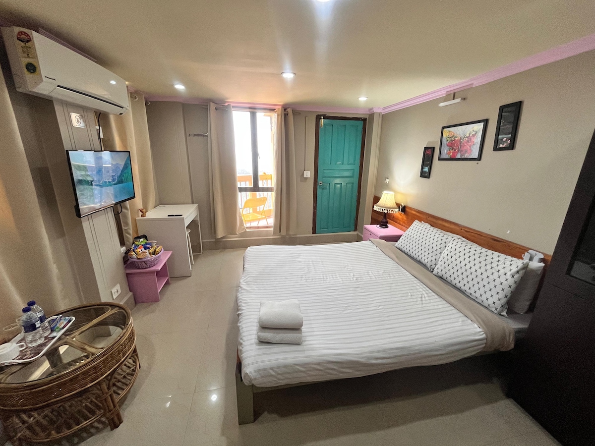Room with Two single bed with modern interiors. One mini refrigerator and two chairs with One table. Big Balcony with excellent view. Quiet place from unwanted noise