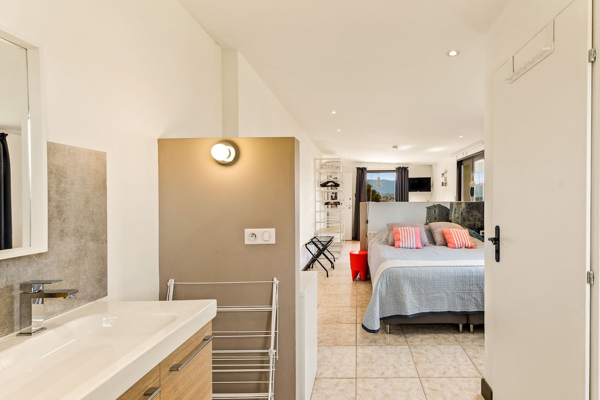 Cette chambre élégante et pleine de charme, plein sud vous offre une vue sur la mer et un accès à la piscine. Proche de la mer accès à 300m seulement pour une petite baignade matinale idéale pour un week-end ou déplacement d’affaire ou même entre deux locations pour une arrivée avant la date La piscine est à partager avec d’autres locataires de 10h à 19h30 uniquement