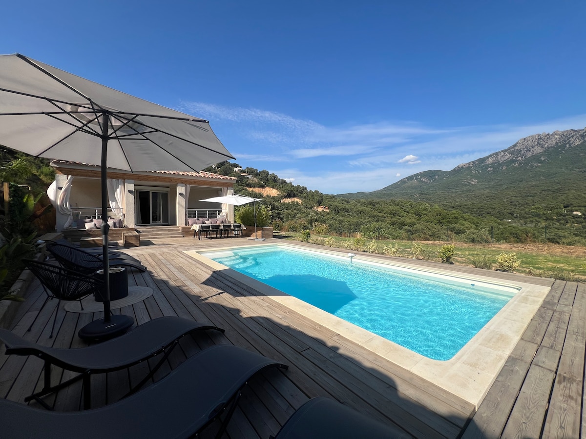 Villa moderne de plain pied de 120 m², idéale pour des vacances en famille ou entre amis dans un cadre paisible et calme. La villa est composée de 3 chambres avec salle de bain/eau, d'une pièce de vie cuisine/salon donnant sur une terrasse avec piscine, braséro et salon de jardin. De la terrasse vous aurez une vue sur les vignes et montagnes environnantes. Draps, serviettes fournis Idéalement situé à de 3min du centre ville, des plages et de l'embarcadère pour prendre la navette vers Ajaccio.