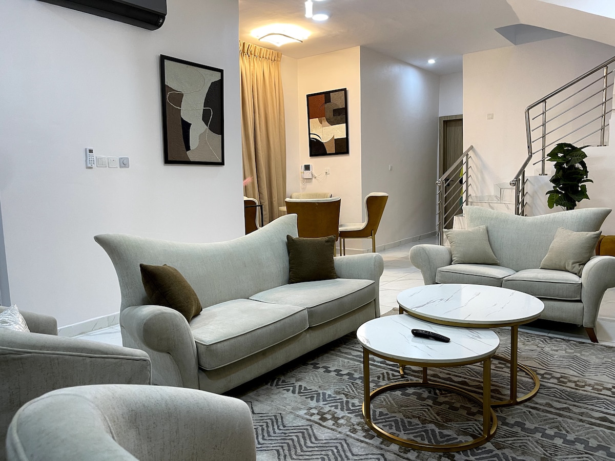 Family friendly spacious 4-bedroom contemporary house with lovely ambience in a serviced and secured estate with nearby attractions like supermarkets, bars, restaurants and cinema. The house is fully furnished and equipped to meet your need with; **24-hours power (with 10kva inverter as backup) **24/7 security **Beautiful and comfy living room and dining room. **2 Balcony on 2-floors **Equipped kitchen **Netflix and DSTV (Cable TV) **Home cleaning **Fast Internet (Fiber-optic internet)