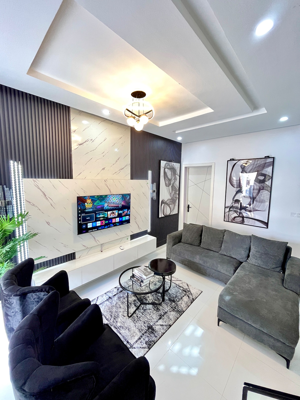 Family friendly spacious 4-bedroom contemporary house with lovely ambience in a serviced and secured estate with nearby attractions like supermarkets, bars, restaurants and cinema. The house is fully furnished and equipped to meet your need with; **24-hours power (with 10kva inverter as backup) **24/7 security **Beautiful and comfy living room and dining room. **2 Balcony on 2-floors **Equipped kitchen **Netflix and DSTV (Cable TV) **Home cleaning **Fast Internet (Fiber-optic internet)