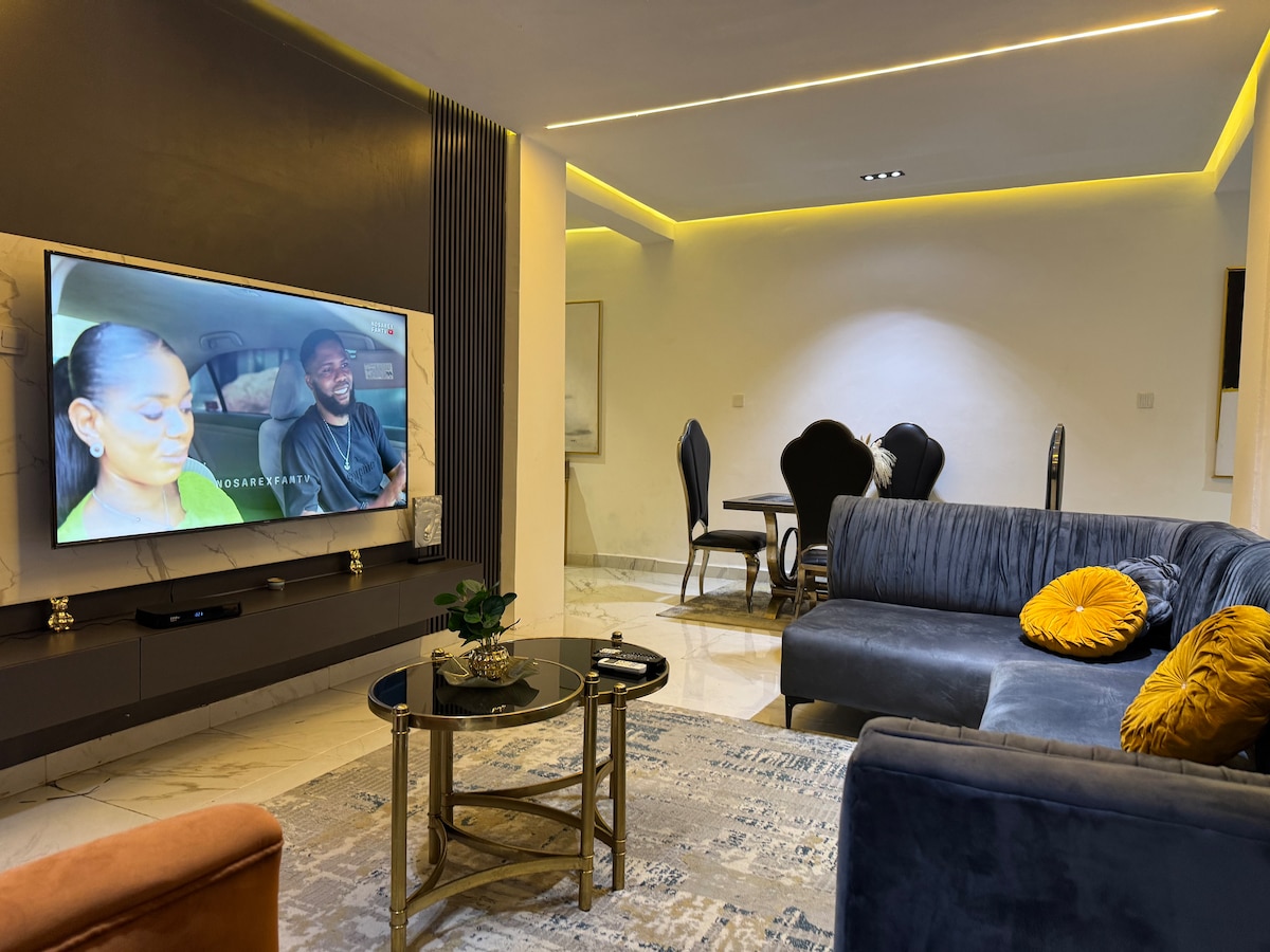 Step into pure comfort at this luxury 2-bed, 2-bath apartment in serene Lekki ikota. Enjoy movie nights with a 65" Smart TV in the living room, 55" & 42" in both bedrooms with a Ps5 game for indoor entertainment. A fully equipped kitchen with a Samsung double-door fridge and ice maker. Stay connected with fast Wi-Fi, enjoy 24/7 power with our lithium battery, free parking, and easy self check-in via smartlock. Close to Mega Chicken, Jendor, The Place & more! Perfect for families, couples, etc.