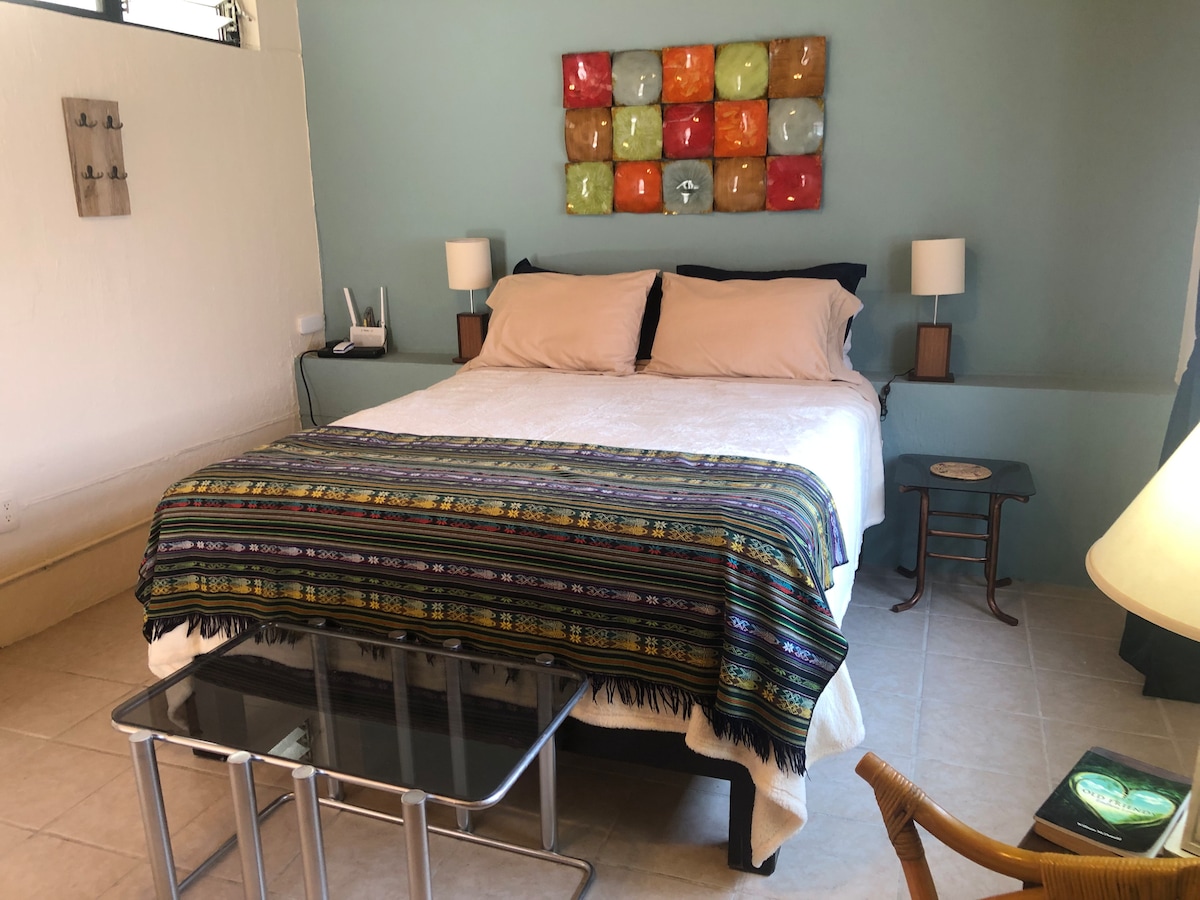 A NO SMOKING and NON-SMOKER Property! Conveniently located in the heart of Ajijic Village, La Casita is a detached room with tile bathroom and rooftop Patio offering mountain and lake views. Bed is matrimonial/full sized with Serta Memory mattress and quality bedding. Wifi, TV, in-room mini fridge and coffee maker. Shared kitchen use available with weekly/monthly reservations only.