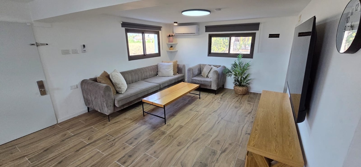A new and beautifully designed unit in Kibbutz Reshafim, in the Valley of Springs near the natural springs. Located on a private second floor, the unit includes three bedrooms – two with double beds and one with a bunk bed and pull-out bed. Features a fully equipped kitchen, dining area, living room with TV and Wi-Fi, and a sun terrace with a small pool, lounge area, bar table, gas grill, and amazing Mount Gilboa views. No events or loud music on the terrace.