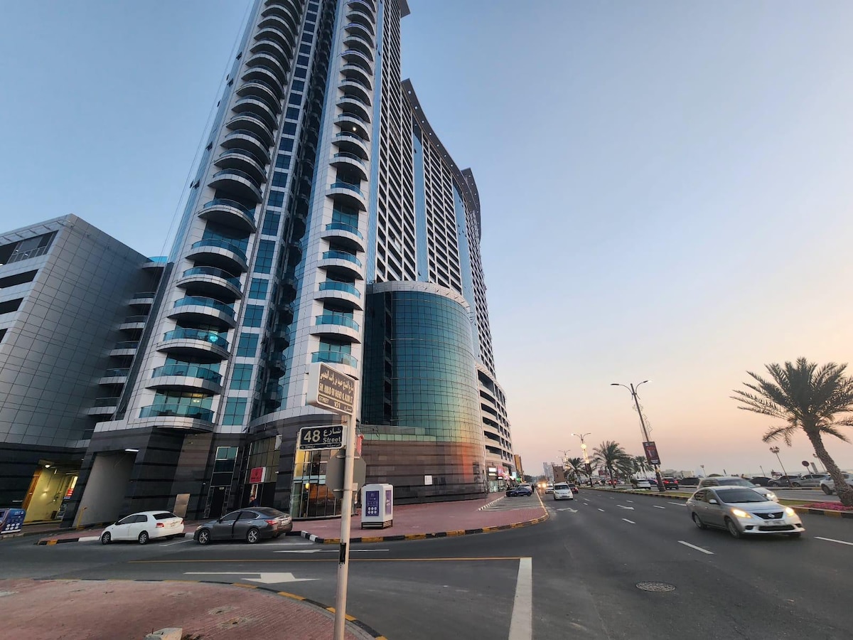 Bienvenue dans notre appartement d'une chambre à coucher, à 8 minutes en voiture de la plage. Profitez d'un salon lumineux avec canapé et TV, de 2 salles de bain , et d'une cuisine entièrement équipée. Wi-Fi gratuit Chambre confortable pour une bonne nuit de sommeil. Proche de supermarchés, restaurants, et boutiques, avec un accès facile aux transports. Parking gratuit disponible Tout les voyageurs auront la carte de parking mais en cas de perte il faudra payer 300aed