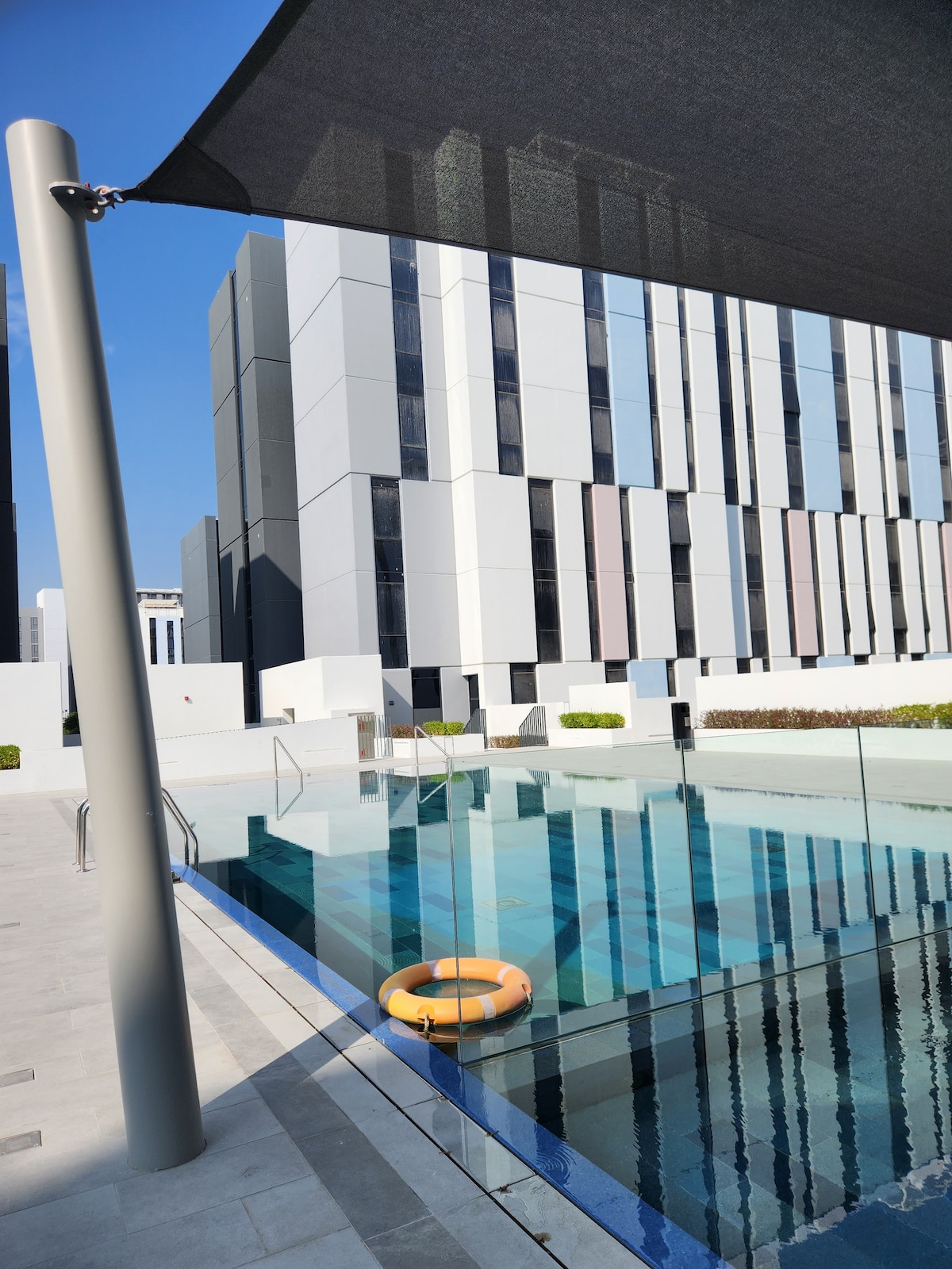 Keep it simple at this peaceful and centrally-located place. Brand new apartment with pool view and unique apartment in prime location family friendly apartment Includes Appliances •Oven •Electric stove •iron •iton stand •clothes dryer •washing machine •fridge •fited wardrobe • bed •Tv+Tv stand Amenities •Swimming Pools •Gym •covered parking •carrefour •school •Mosque