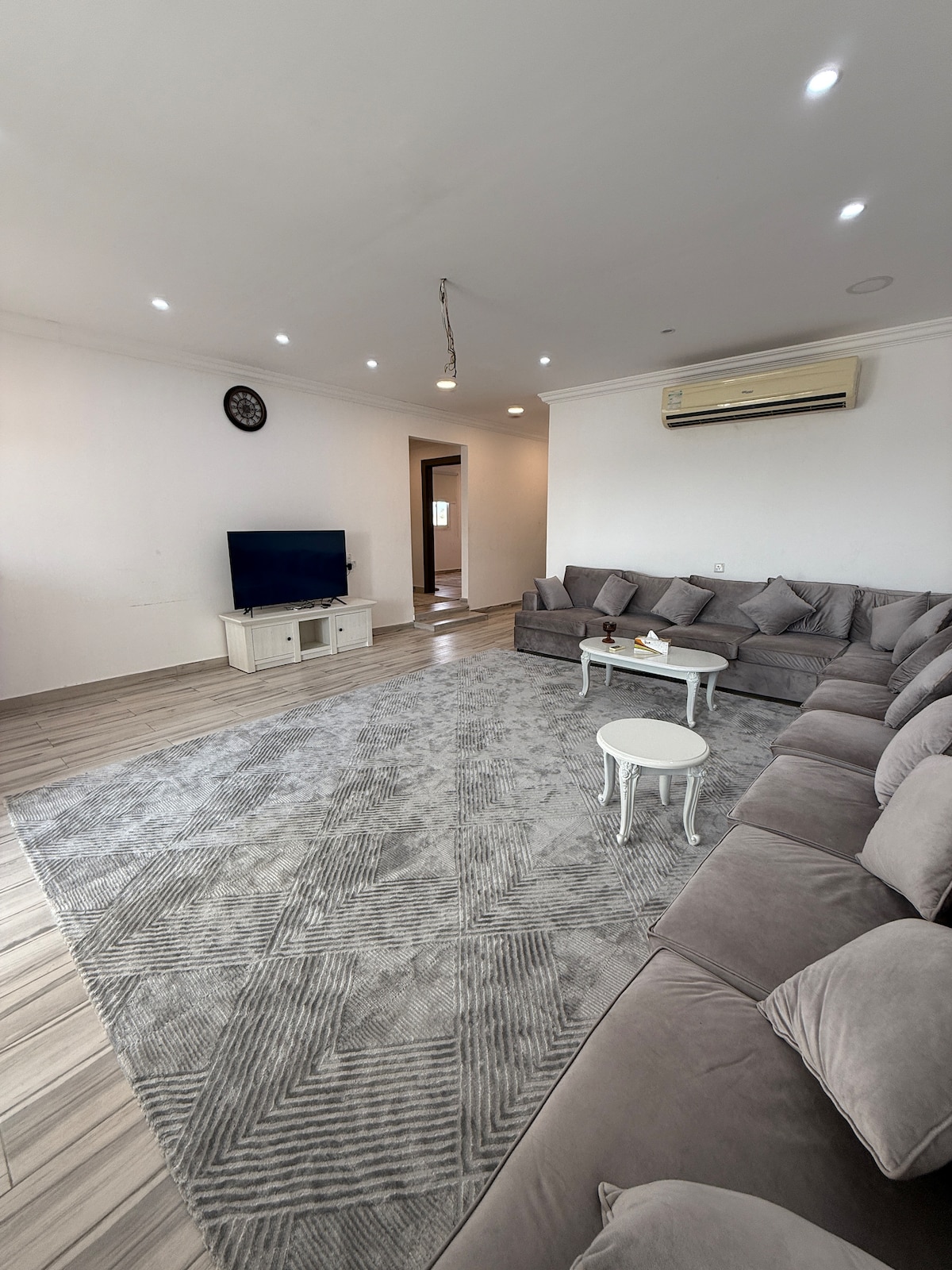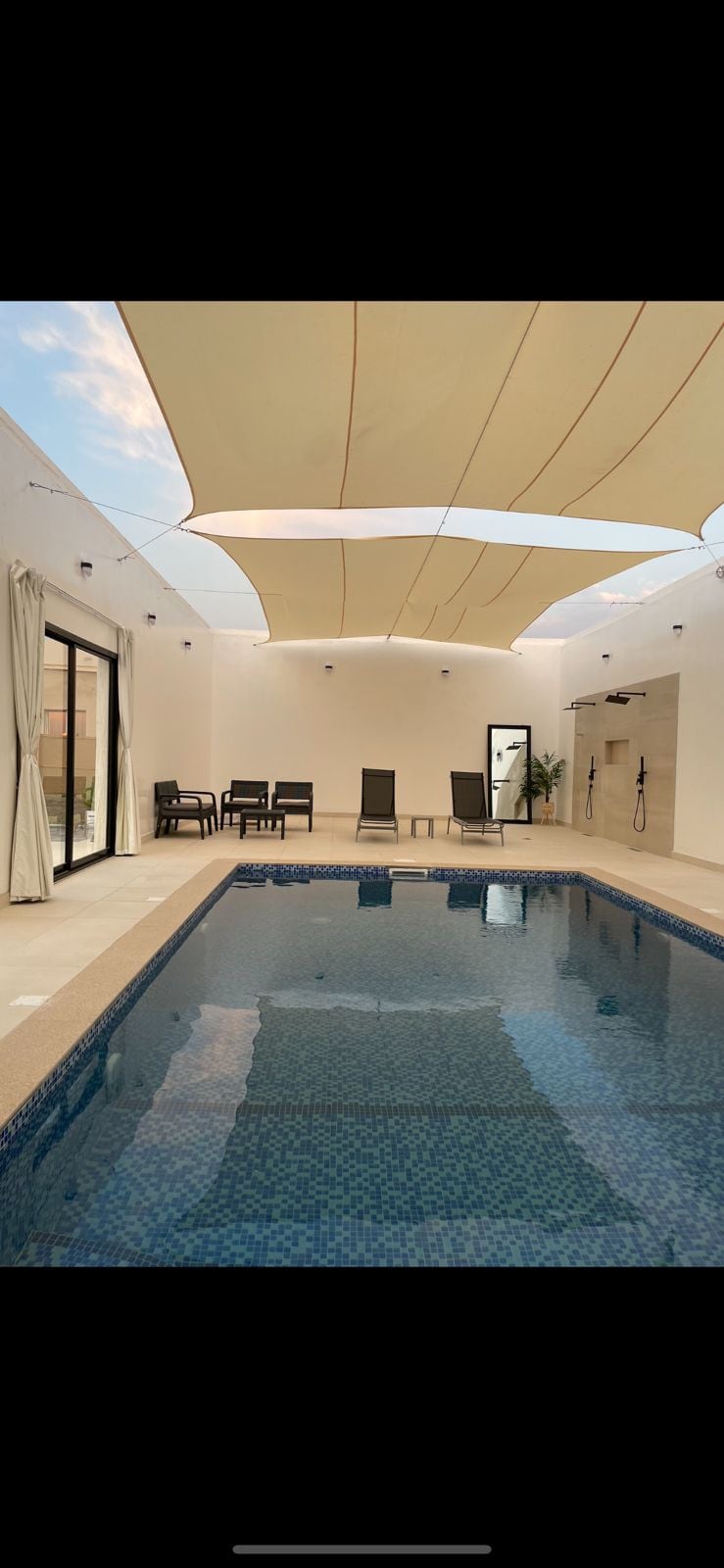 Welcome to this modern and elegant 2-bedroom villa, designed to offer comfort, privacy, and a relaxing stay for families and friends. The villa features a bright and spacious living room with stylish seating and a large TV, perfect for unwinding after a long day. Floor-to-ceiling windows allow natural light to fill the space, creating a warm and welcoming atmosphere.