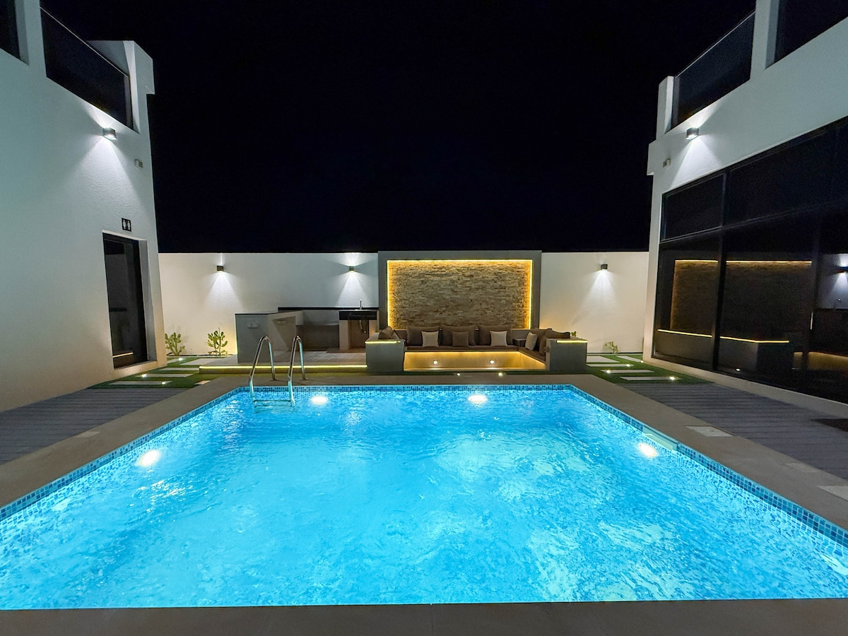 3 bed, 4 bathroom family Villa, ultimate retreat for families or groups seeking comfort, entertainment and relaxation. Located in Ajman, 35 mins away from DXB Dubai Airport, within walking distance of local small shops and beach bars and restaurants a short drive away. All Bedrooms have en suite bathrooms & king size beds. Cinema room & kids play area on ground floor. Spacious fully equipped kitchen, dinning and lounge area. Rooftop plunge pool, bar, barbecue and table tennis. Air con throughout