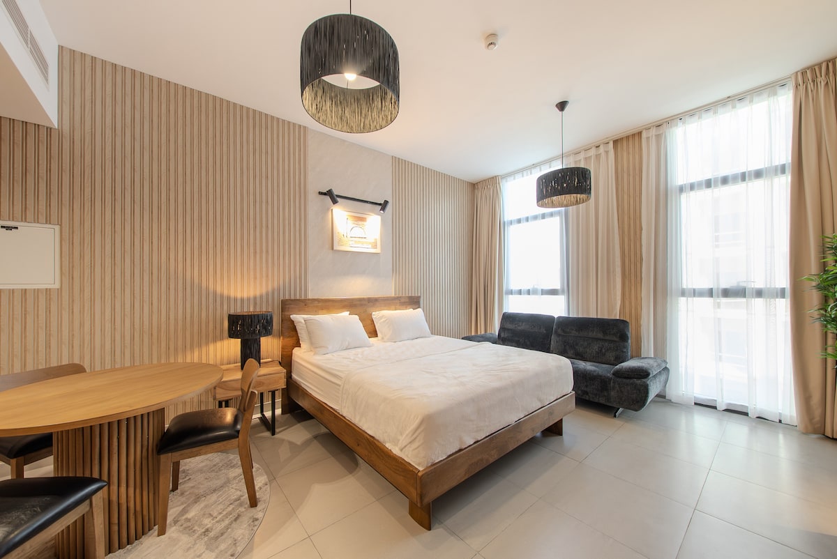 Welcome to our Luxury studio apartment in Al Mamsha Brand new Apartment built in 2025 Al Mamsha offers a variety of coffee shops, cafes, grocery stores, and play areas, making it a vibrant destination. TV With Netflix Kitchen with all utensils. Free Private Parking. Pool Access Enjoy quick access to Sharjah Airport (10 mins) and Dubai Airport (20 mins) Free High Speed Wifi