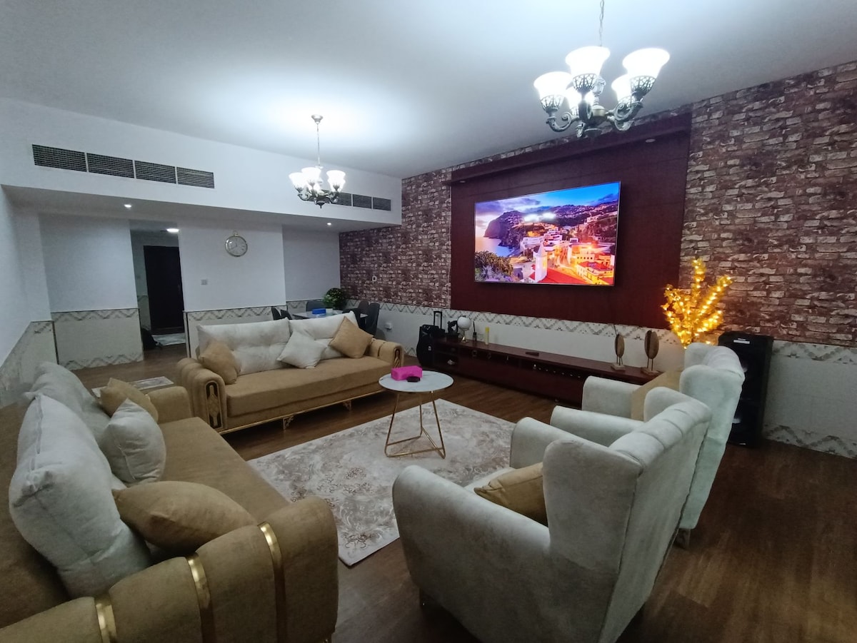 spacious two bedroom apartment in the Ajman which can accommodate up to 12 persons. it is central located with easy access to highway leh and Dubai. Dubai international Airbnb is 25 minutes away and downtown Dubai is 35 minutes away. the building has a shopping mall in the ground floor with everything that you might need is there. the hall is big with 85 inch TV and and a speaker with mic. the main bedroom is ensuite with big,. comfortable bed and a baby crib.