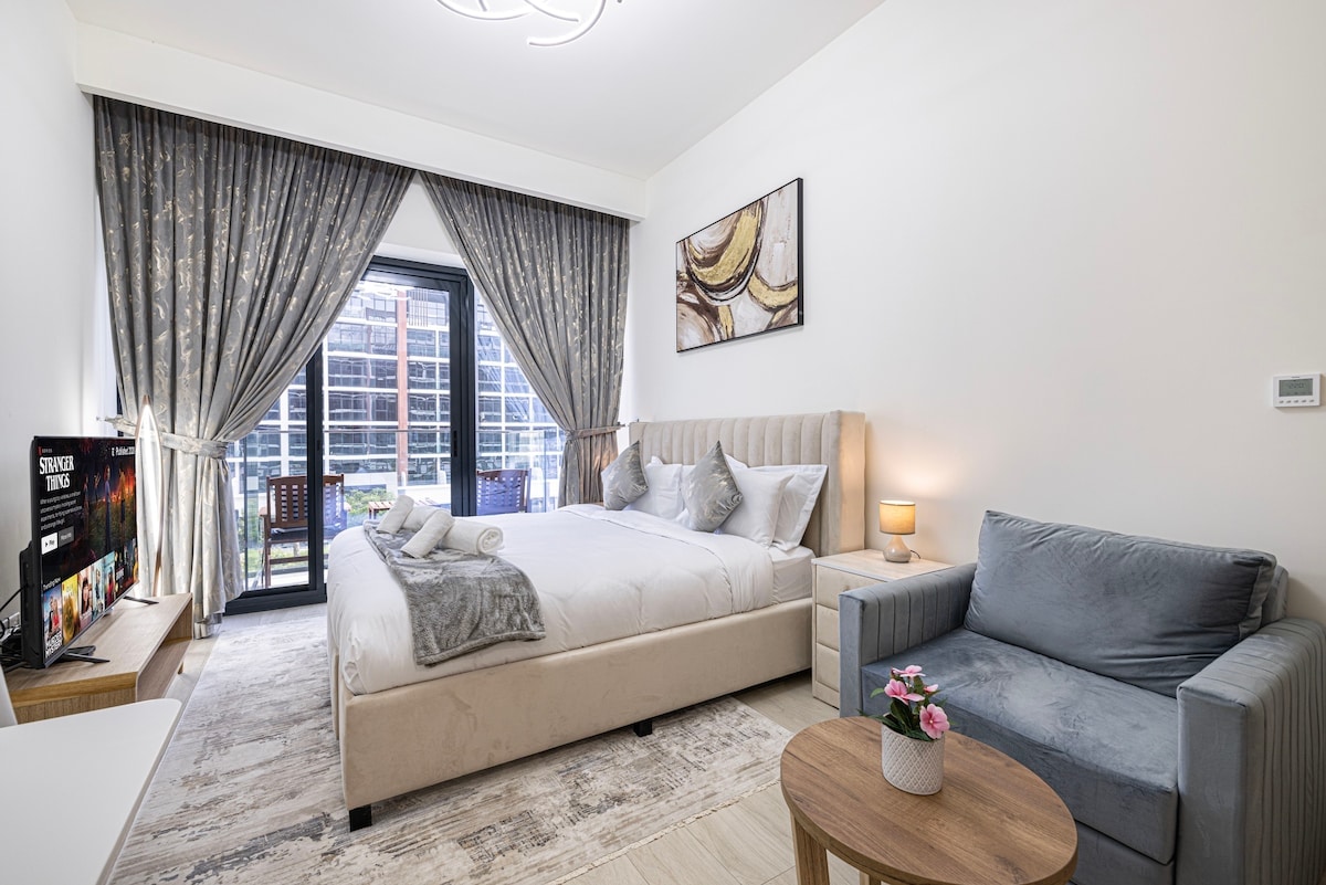 Welcome to our brand new studio in Azizi Riviera 28! 🌟 Enjoy sleek amenities and a stunning pool view from your private balcony. Located in the vibrant heart of Meydan, this chic space is perfect for solo travelers or couples. The studio boasts a comfy bed, fully equipped kitchen, Smart TV, high-speed internet, and a stylish bathroom. Dive into the building's pool, hit the gym, and enjoy 24/7 security. Only 10 minutes by car to Burj Khalifa and Dubai Mall. Book your stay today! ✨🏙️