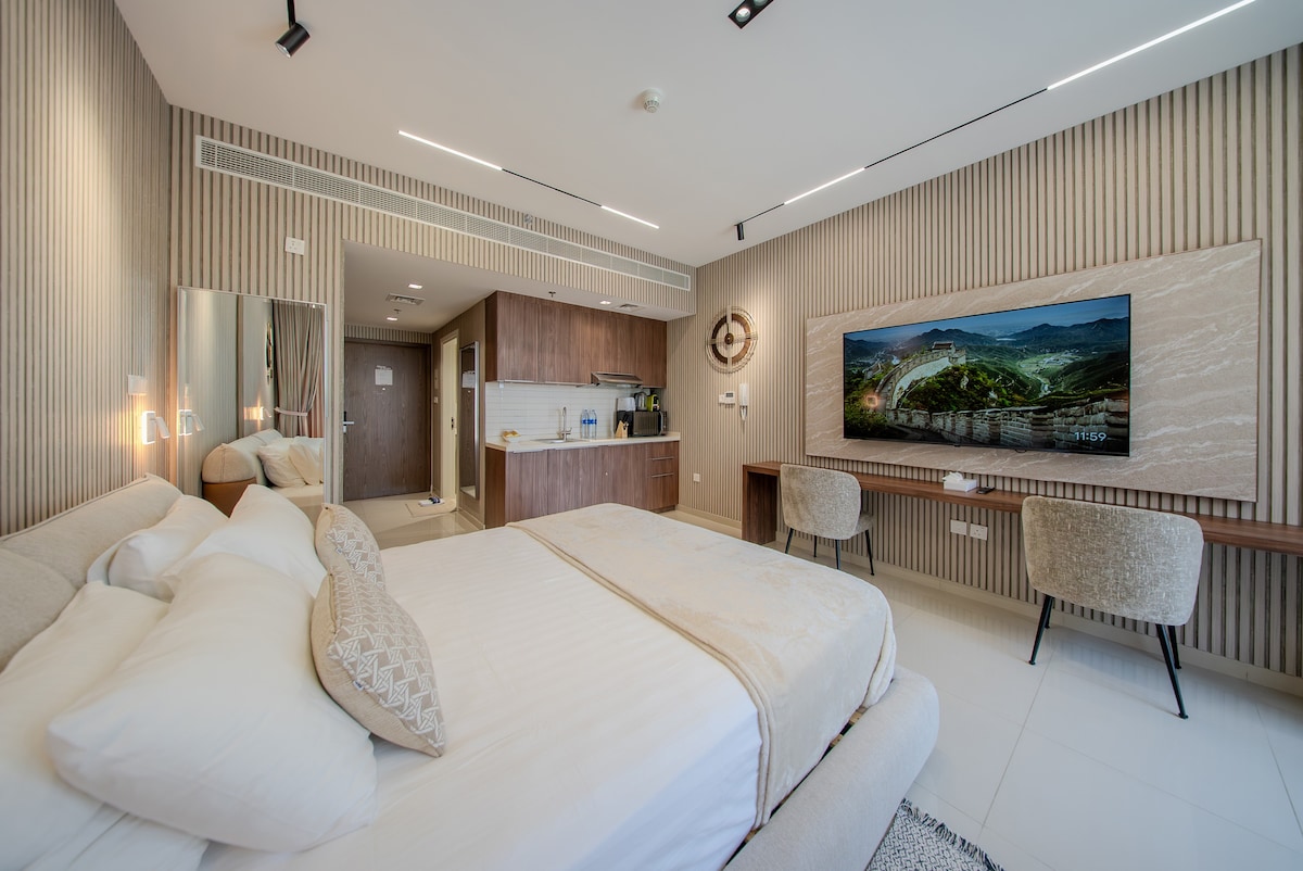 Elegant studio in the iconic SLS Tower, Business Bay. Enjoy a king bed, cosy lounge, smart TV, high-speed WiFi, and a fully equipped kitchenette. Relax on the balcony with panoramic city views or unwind in two rooftop infinity pools. Amenities include a modern gym, luxury spa, restaurants, 24/7 concierge, and valet. Just 5 minutes from Downtown, Dubai Mall, and Dubai Canal its perfect for couples, business travelers or holiday guests looking for elevated comfort with unmatched convenience.
