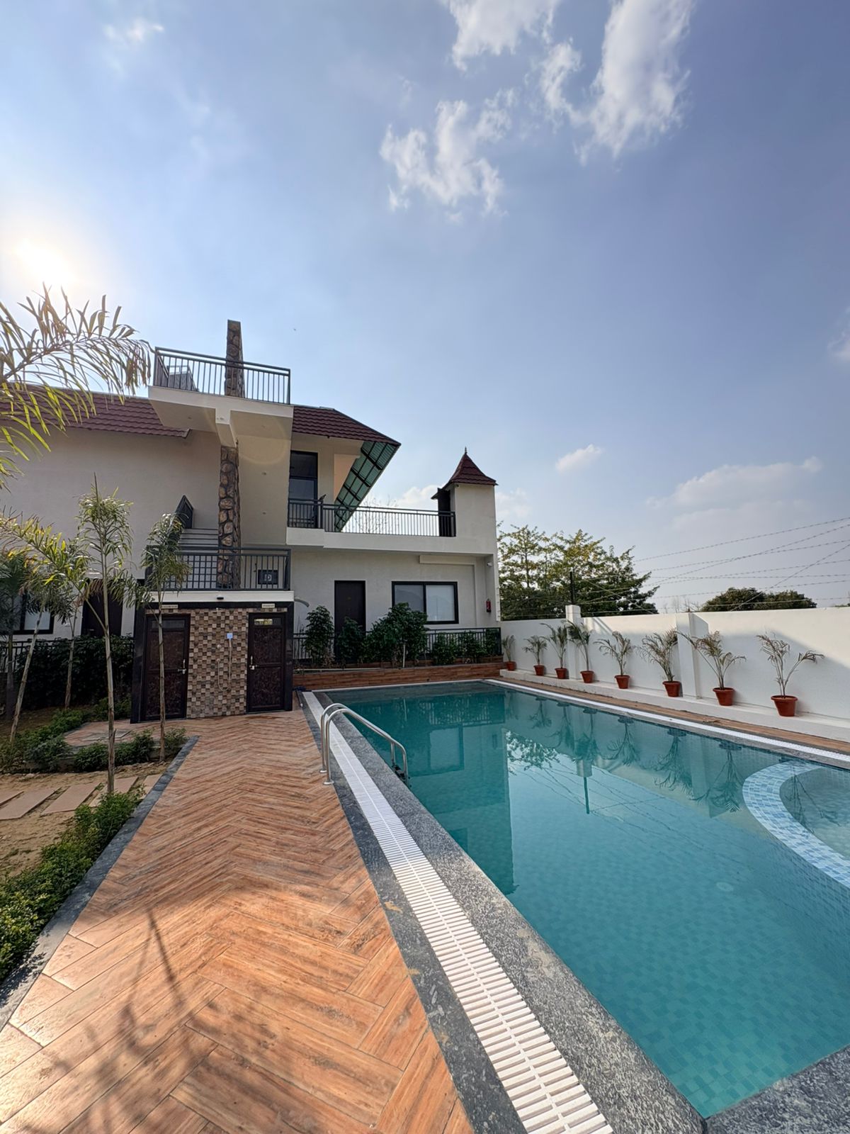 Escape to Aanandam Retreat, a peaceful 2-room luxury cottage in Ajmer with a private pool, green lawn, and rooftop machhan for sunrise views and stargazing. Guests love the blend of comfort and nature – cozy bedrooms with modern amenities, an outdoor kitchen for authentic cooking, and experiences like organic farming, bonfire nights, and lake treks. Pet-friendly and surrounded by greenery, it’s ideal for families, couples, and groups to relax, reconnect, and create lasting memories.