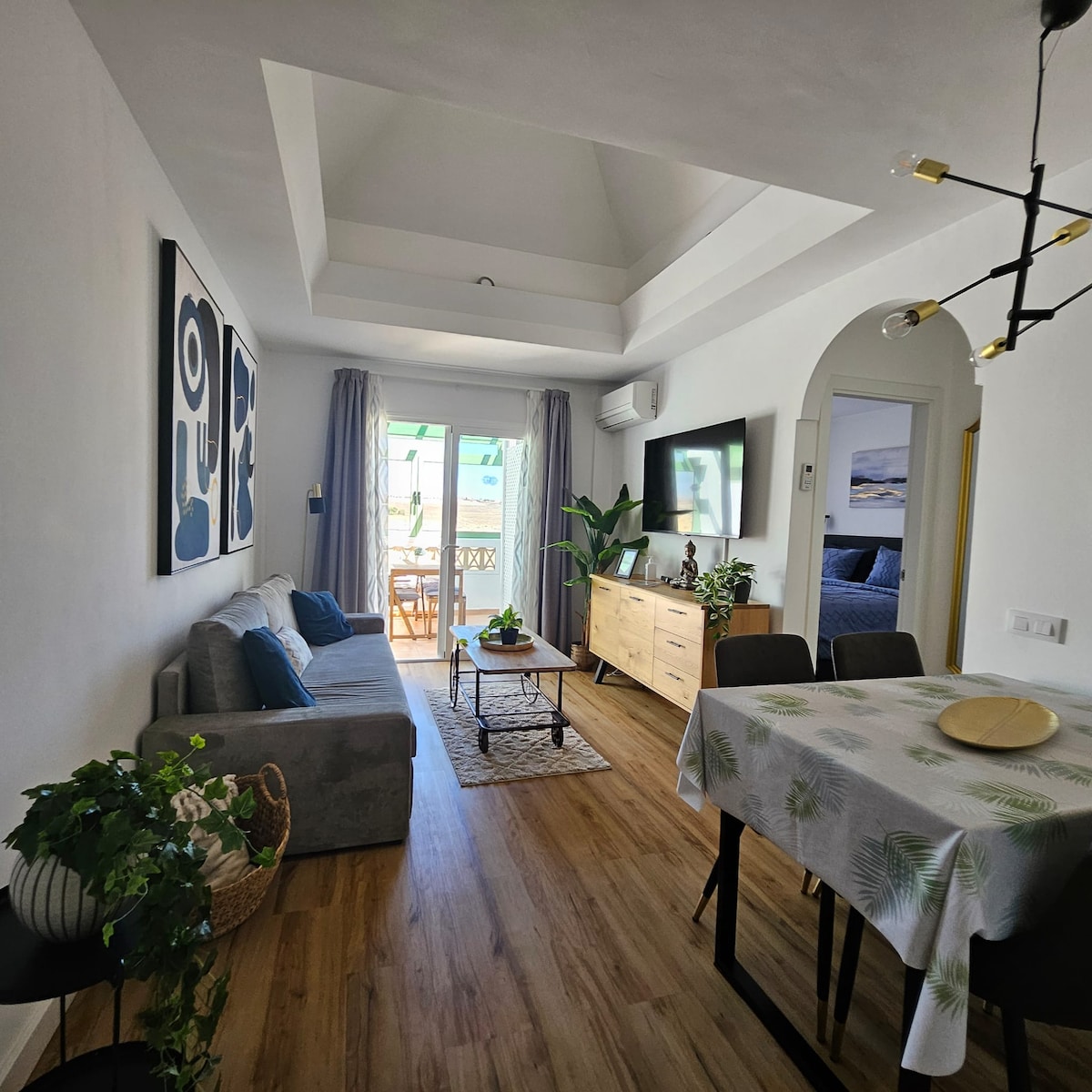El apartamento se encuentra en un primer piso con vistas al mar y al pueblo. Tiene una pequeña terraza. En el interior tenemos el salón y salón comedor con cocina equipada .Un baño con plato de ducha y un dormitorio con cama de matrimonio.