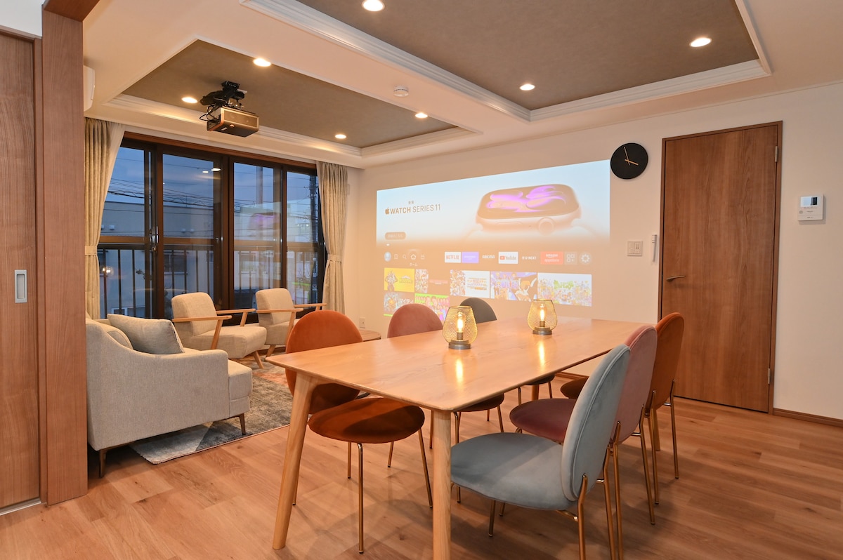 【2泊以上:旭川空港・駅からタクシー1台片道無料+6名以上2台無料】 北海道で最も人気のある寿司店のトリトンが(車3分1.5km)で非常に便利です🍣 旭川空港から近く、富良野、美瑛にも続く道にありアクセスに便利なお部屋です。 お部屋全体をフルリフォームしたので、新築同様にキレイで清潔です✨ 鍵は宿泊者で毎回暗証番号が変わるのでセキュリティが安心です🔐 2家族+乳児1名でも余裕があります! お部屋が2Fにあるので階段を登ります。足腰に不安がある年配の方はご留意ください。 【主な特徴】 ●美味しい飲食店が徒歩圏内多数ある🍻 ●寝室3部屋、ベッド6台🛏️ ●🛁バスルーム2、🚽トイレ2、💄洗面化粧台2 ●150インチ4Kプロジェクターシアター📽️ ●300M程度の高速wifi⚡️ ●ベビーベッド、チェア、バウンサー、バス👶 周辺にも飲食店が沢山あるので全く困りません!皆さんで探検してみてください🍻