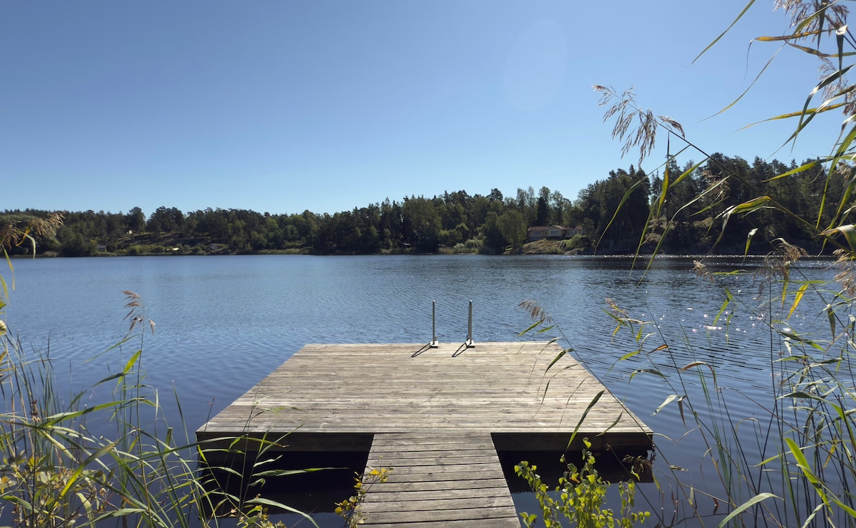This house is right at the waters edge. 63 sq meter. Very calm, perfect for a romantic weekend. Light a open fire, take at bath in the hot tub beside the house, listen to the waves and drink a glass wine. Sun-set dining. Dive in the Baltic Sea from the jetty after the hot tub. Watch the ferries and yachts pass by. Close to slalompist in Stockholm. 20 minutes to Stockholm city with car, or take a bus or a ferry. Or take a tour in the archipelago. 1 double kayak and 2 single kayaks are included.